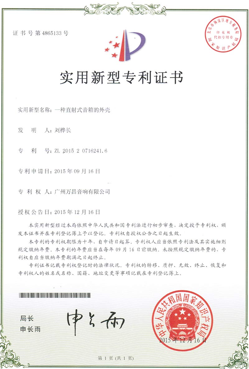 爵士龍-一種直射式音箱的外殼 實用新型專利證書